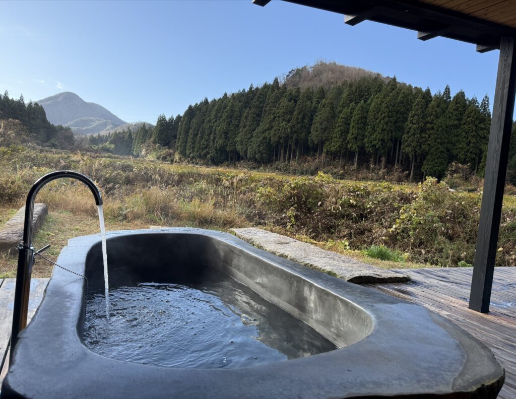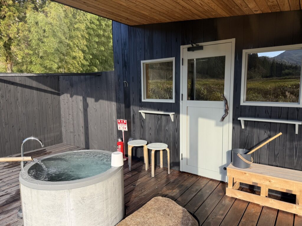 一棟貸切タイプで、石を掘ったお風呂と水風呂。