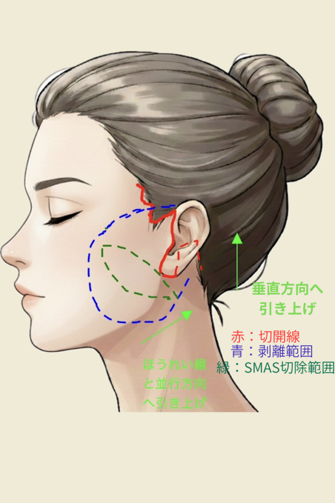 耳前部の耳のきわの部分から側頭部を切開し、引き上げます。皮下にあるSMASという筋膜を剥がすことに抵抗がある方、斜め上ではなく上方向に引き上げてほしい方に適応です。