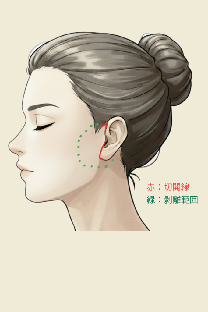 側頭部から耳前部の耳のきわの部分、耳介後面へと切開し、引き上げます。切開線はフェイスリフトと同じ範囲となります。