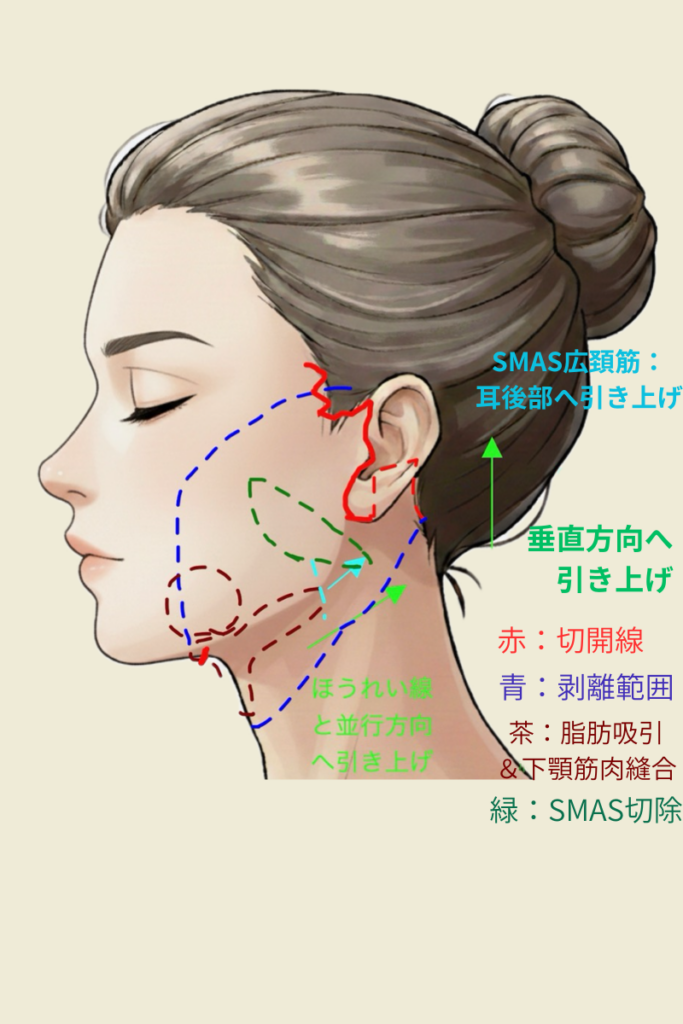 皮下にあるSMASという筋膜を剥がし、筋膜弁を作成し、一部筋膜を切除するなど筋膜に手術操作を加えます。