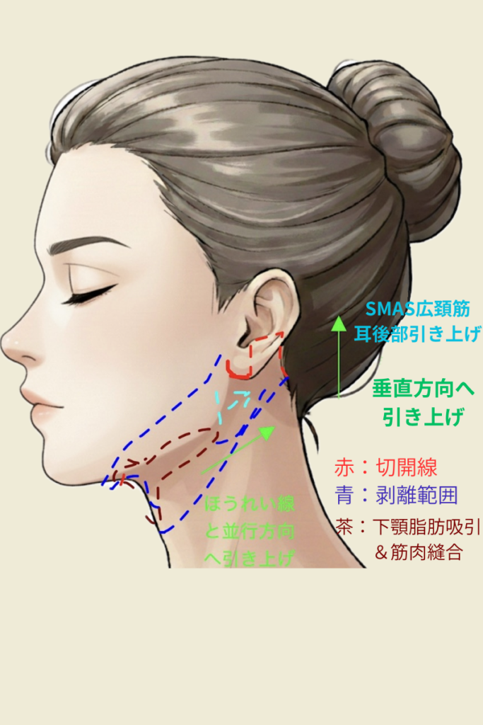 SMASを剥がし引き上げる事で、ほうれい線と並行方向への引き上げ、広頚筋弁を耳後部へと引き上げますので、首元のたるみにも効果的です。